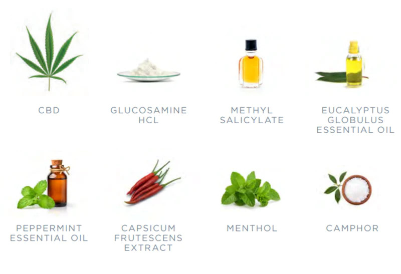 Összetevők: magas koncentrációjú kannabidiol (1,50%CBD), glükozamin HCL, metil-szalicilát, eukaliptusz globulus illóolaj, borsmenta illóolaj, paprika kivonat, mentol, kámfor, víz, kapril triglicerid, glicerin, nátrium-poliakrilát, propilénglikol, alkohol-denat., nátrium-sztearoil-glutamát, fenoxi-etanol, Capsicum Frutescens gyümölcskivonat, etil-hexilglicerin, limonén, dinátrium-EDTA, linalool